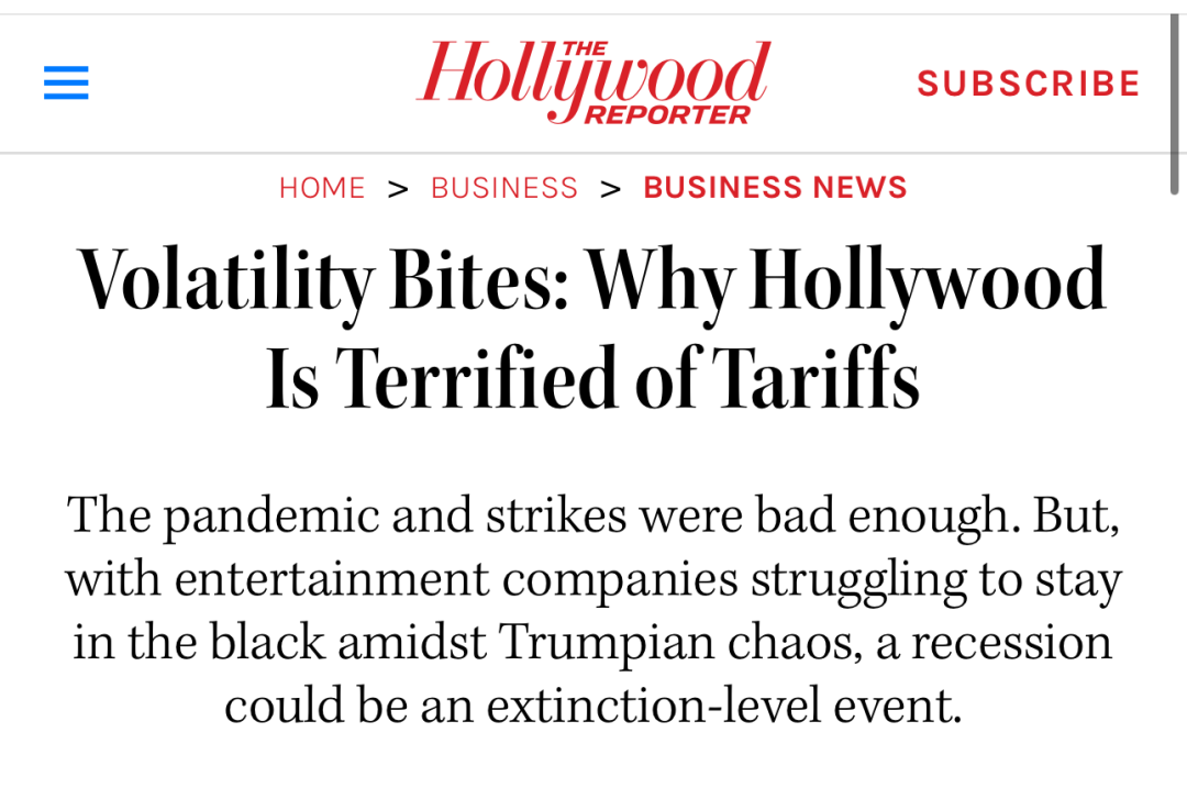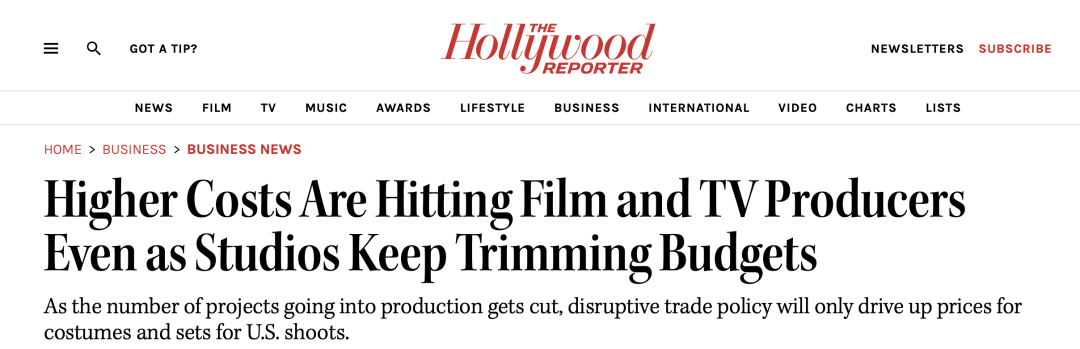 这是《好莱坞报道者》颁发的一篇题为《正在片子行业缩减预算之际,美国片子制制商还要面对高额关税夹击》的报道。