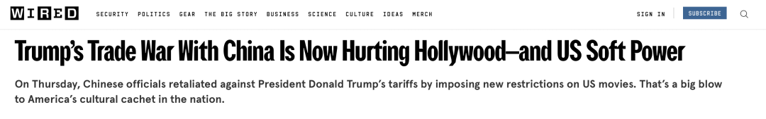 这是美国《WIRED》颁发的一篇报道,从题是特朗普对华倡议商业和正好莱坞取美国软实力。