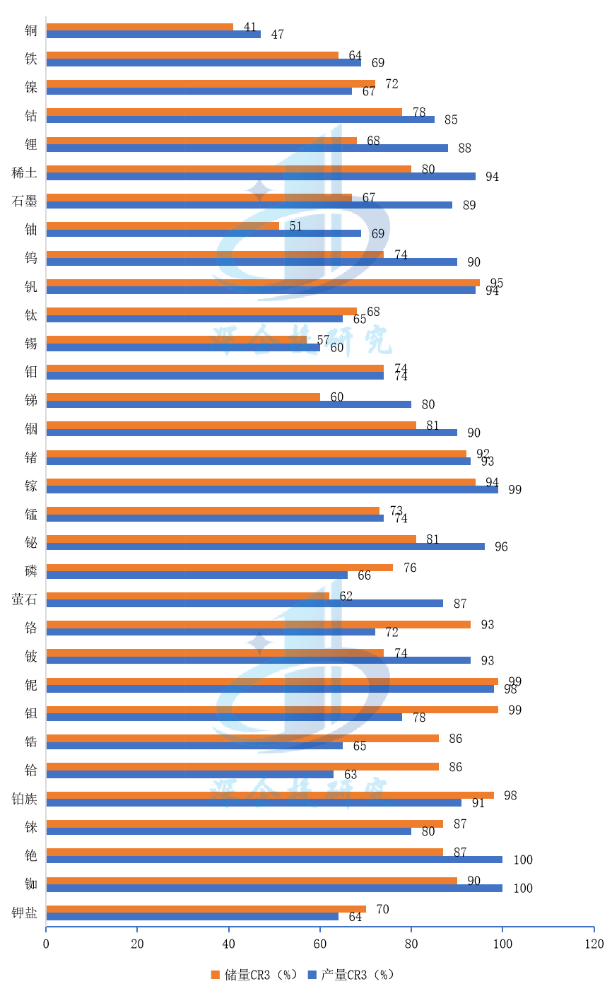 做为大商品的环节矿产中,铜、铁、镍、铬、锰、锡等分布也较为集中。铜的储量和产量CR3别离为41%、47%,铁的储量和产量CR3别离为64%、69%,镍的储量和产量CR3别离为72%、67%,铬的储量和产量CR3别离为93%、72%,锰的储量和产量CR3别离为73%、74%,锡的储量和产量CR3别离为57%、60%。