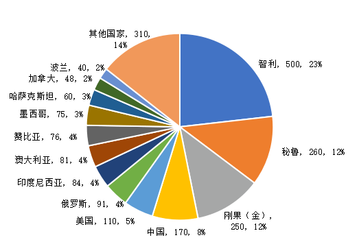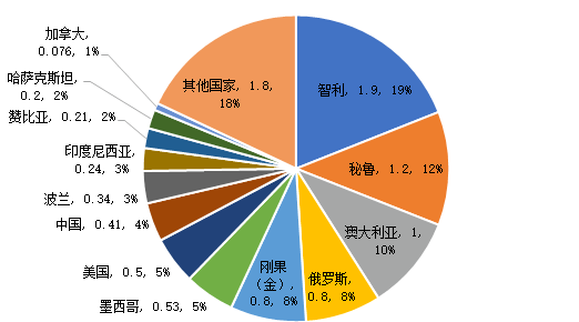 ——全球储量分布。按照美国地质查询拜访局(USGS)2024年1月发布的演讲,截止2023岁暮,全球已探明可开采的铜储量为10亿吨,次要分布国度包罗智利(1。9 亿吨)、秘鲁(1。2亿吨)、(1亿吨)、俄罗斯(0。8亿吨)、刚果(金)(0。8亿吨)、墨西哥(0。53 亿吨)和美国(0。5亿吨)、中国(0。41亿吨)等,如下图所示。