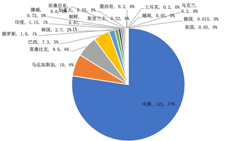 ——全球出产环境。美国地质勘察局(USGS)的演讲显示,2023年全球天然石墨产量160万吨,此中中国产量123万吨,占全球比沉为77%;其他出产国还有马达加斯加(10万吨)、莫桑比克(9。6万吨)、巴西(7。3万吨)等,如下图所示。