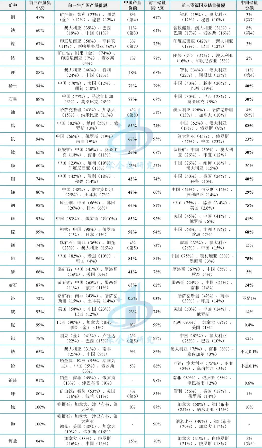 以次要环节矿产的储量和产量(原生金属)份额集中度为例,前三国度储量占比(CR3)达到或跨越80%的环节矿产10余种,包罗稀土(约80%)、钒(95%)、铟(81%)、锗(92%)、镓(94%)、铋(81%)、铬(93%)、铌(99%)、钽(99%)、锆(86%)、铪(86%)、铂族(98%)、铼(87%)、铯(87%)、铷(90%)等;产量CR3达到或跨越80%的环节矿产约20种,包罗钴(85%)、锂(88%)、稀土(94%)、石墨(89%)、钨(90%)、钒(94%)、锑(80%)、铟(90%)、锗(93%)、镓(99%)、铋(96%)、萤石(87%)、铍(93%)、铌(98%)、铂族(91%)、铼(80%)、铯(100%)、铷(100%)等。