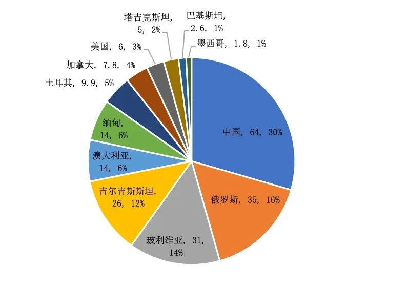 ——全球储量分布。按照美国地质查询拜访局(USGS)的数据,截止2023岁暮,全球锑矿石储量约为217万吨,次要国度储量为:中国储量64万吨,俄罗斯35万吨,玻利维亚31万吨,吉尔吉斯斯坦26万吨,14万吨,缅甸14万吨,7。8万吨,塔吉克斯坦5万吨,如下图所示。