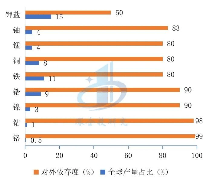 第三类是国内供应较着欠缺,对外依存度高,但全球供应风险当前可控的计谋性矿产。这类矿产国内储量和矿石产量全球占比低,矿石进口依存度高(50%以上),但中资企业通过全球投资结构,总体上可以或许保障海外矿石、原料供应,并正在金属精辟上构成全球产能劣势,具体矿种包罗镍、钴、锰、铜、铁、钾盐、铀、铬、锆等,以大商品类矿产为从。