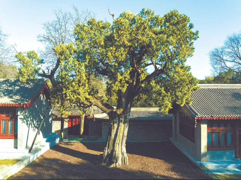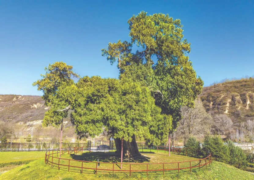 黄帝手植柏是黄帝陵古柏群中最陈旧的一株侧柏,相传为轩辕黄帝所栽,粗壮的树干七小我手拉动手合抱不拢。