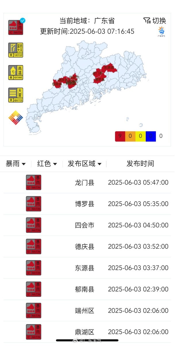 据广东气候动静:估计,3日,粤东和珠三角南部市县仍有大雨局部暴雨,雷雨时并伴有8级摆布的雷暴大风;4日降雨削弱,南部市县仍有中雨局部大雨或暴雨。6月2日起,广东遭到新一轮“龙舟水”气候影响,截至3日早高峰时段,多地仍受“龙舟水”气候影响,部门预警区域需要发布第一流此外暴雨红色预警信号。按照广东气候网数据,截至3日7时30分,云浮郁南,肇庆鼎湖、端州、德庆、高要、四会,惠州博罗、龙门,河源东源等县市区,维持发布暴雨红色预警信号;茂名、清远、广州、韶关、梅州、潮州等市,有最高暴雨预警至橙色的县市区;江门、佛山、东莞,有最高暴雨预警至的县市区;茂名、肇庆、江门、广州、韶关、东莞、惠州、河源等市,有最高雷雨大风预警至的县市区。