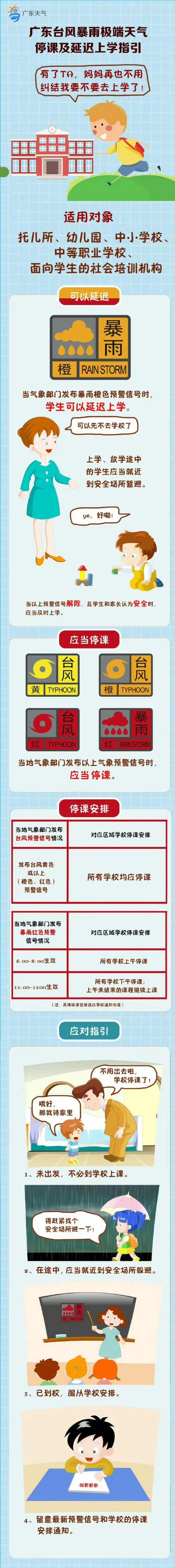 按照《广东省景象形象灾祸防御条例》,当景象形象部分发布暴雨红色预警信号,可视为停课信号,其生效期间,托儿所、长儿园、中小学校、当暴雨橙色预警生效,学生能够延迟上学,下学途中的学生该当就近到平安场合暂避。