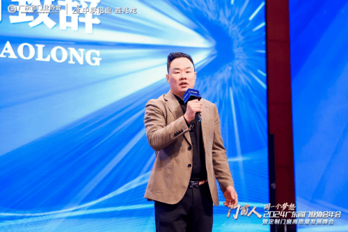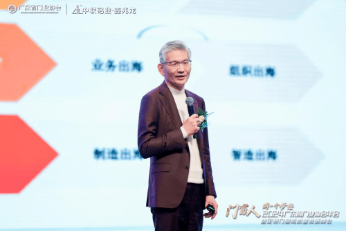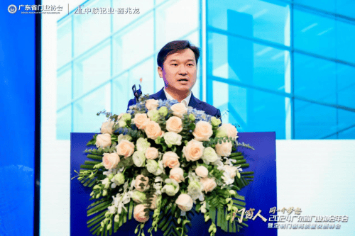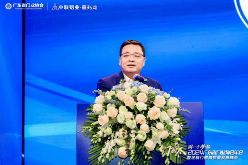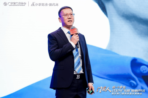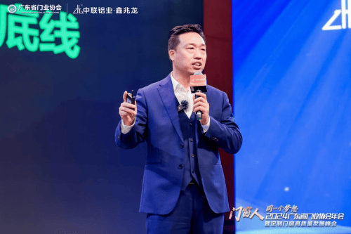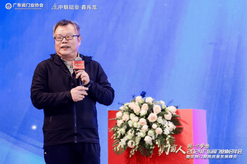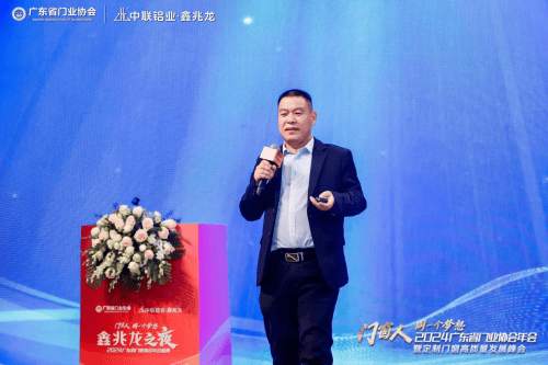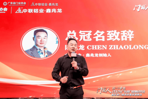 年会总冠名—中联铝业·鑫兆龙创始人陈兆龙为晚宴致辞,他暗示,“鑫兆龙将待人,存心干事的,为客户赋能,为行业做贡献,以高质量的铝木门窗产物,帮力高质量人居。”