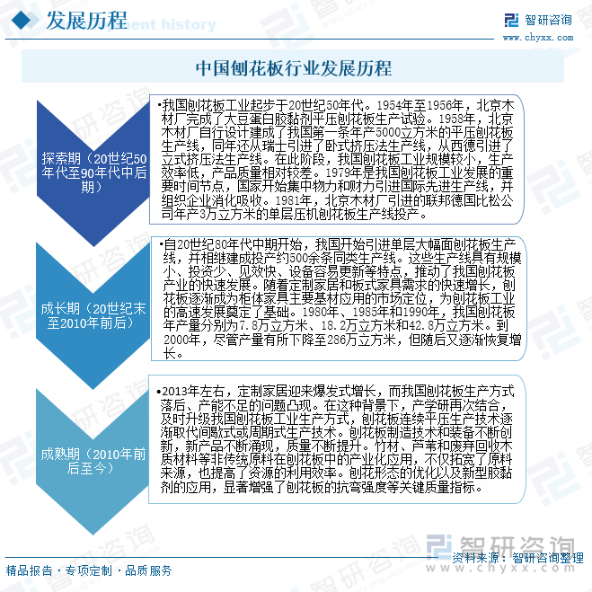 我国刨花板行业的成长过程履历了从初步摸索到快速成长再到成熟不变的阶段。20世纪50年代,我国起头测验考试出产刨花板,但初期因为手艺和设备,产量和质量都相对较低。跟着和手艺引进,80年代中期起头,我国刨花板财产送来了快速成长期,大量出产线建成投产,产量逐年攀升。进入21世纪,定制家居和板式家具市场的快速增加鞭策了刨花板需求的迸发,同时出产体例也履历了从间歇式到持续平压的变化,产能和手艺程度获得了显著提拔。目前,我国刨花板行业已进入成熟期,产量不变增加,使用范畴也不竭拓展,从家居、家具、粉饰等保守范畴逐步延长到全屋拆修、拆卸式建建、包拆材料、建建工程等多个范畴。
